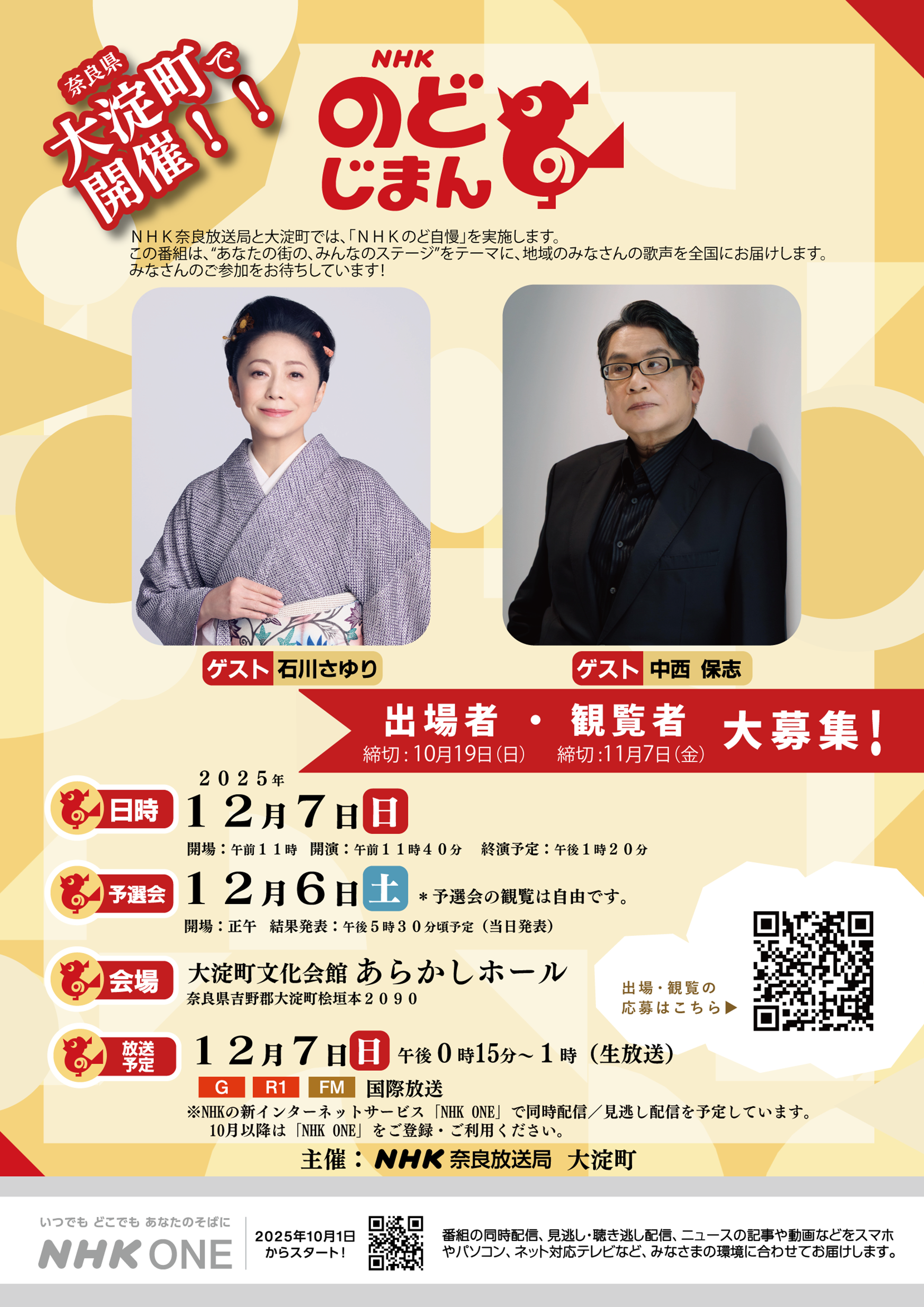 「NHKのど自慢」が奈良県大淀町で開催され、現在出場者および観覧者を募集しています。