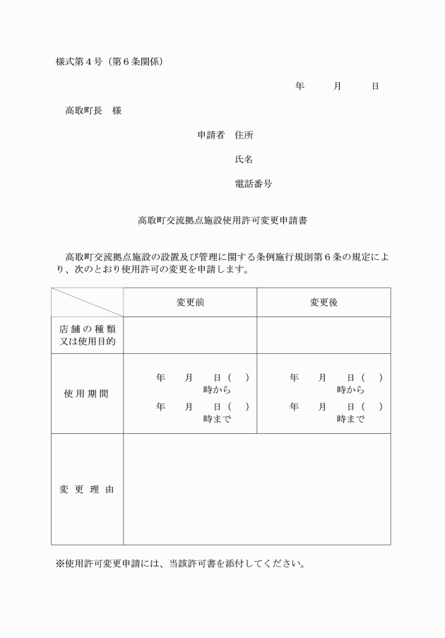 第6条 申請者は、使用許可内容に変更が生じるときは、高取町交流拠点施設使用許可変更申請書(様式第4号)により申請しなければならない。